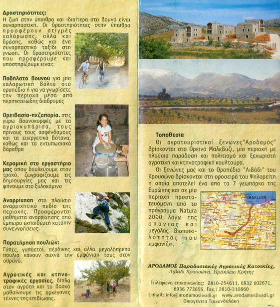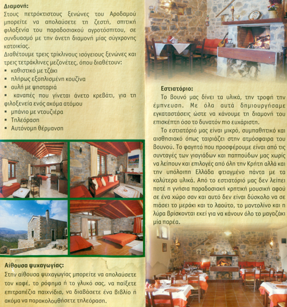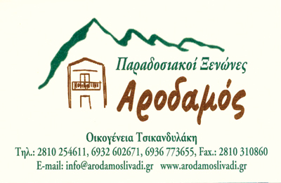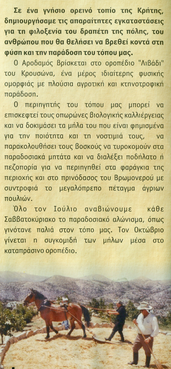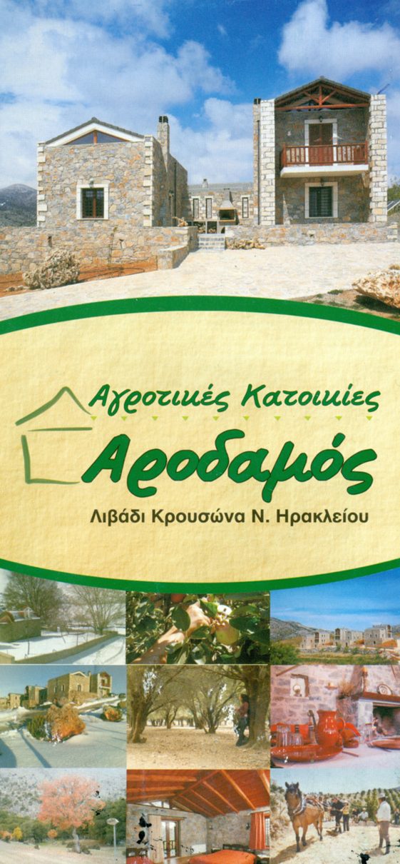 Σε ένα γνήσιο ορεινό τοπίο της Κρήτης, δημιουργήσαμε τα αγροτουριστικά καταλύματα Αροδαμός με τις απαραίτητες εγκαταστάσεις για τη φιλοξενία του δραπέτη της πόλης, του ανθρώπου που θα θελήσει να βρεθεί κοντά στη φύση και την κρητική παράδοση. Oι παραδοσιακοί ξενώνες Αροδαμός βρίσκονται στο οροπέδιο ’Λιβάδι’ του Κρουσώνα στον ορεινό όγκο του Ψηλορείτη στην Κρήτη, σε ένα μέρος ιδιαίτερου φυσικού κάλλους, με πλούσια αγροτική και κτηνοτροφική παράδοση. Τα δυο επιβλητικά φαράγγια που πλαισιώνουν την περιοχή και οι κορυφές που στέκονται αγέρωχες γύρω από το οροπέδιο, συνθέτουν ένα έντονο και ξεχωριστό ορεινό ανάγλυφο, στο οποίο βρίσκει καταφύγιο η άγρια ζωή. Γι’ αυτό, άλλωστε, η περιοχή έχει χαρακτηριστεί ως προστατευόμενη από το πρόγραμμα Natura 2000 Μεγάλα αρπακτικά πουλιά, όπως γύπες και γεράκια, κάνουν πολύ συχνά την εμφάνιση τους στον ουρανό και, όποιος αντικρίσει το μεγαλόπρεπο πέταγμα τους, αισθάνεται απλά τυχερός που είχε μία τόσο προσωπική επαφή με την άγρια φύση. Το οροπέδιο είναι στολισμένο με οπωροφόρα δέντρα, όπως μηλιές και αχλαδιές, τα περισσότερα βιολογικής καλλιέργειας και τα φρούτα του είναι πλέον φημισμένα για την ποιότητα και τη νοστιμιά τους.